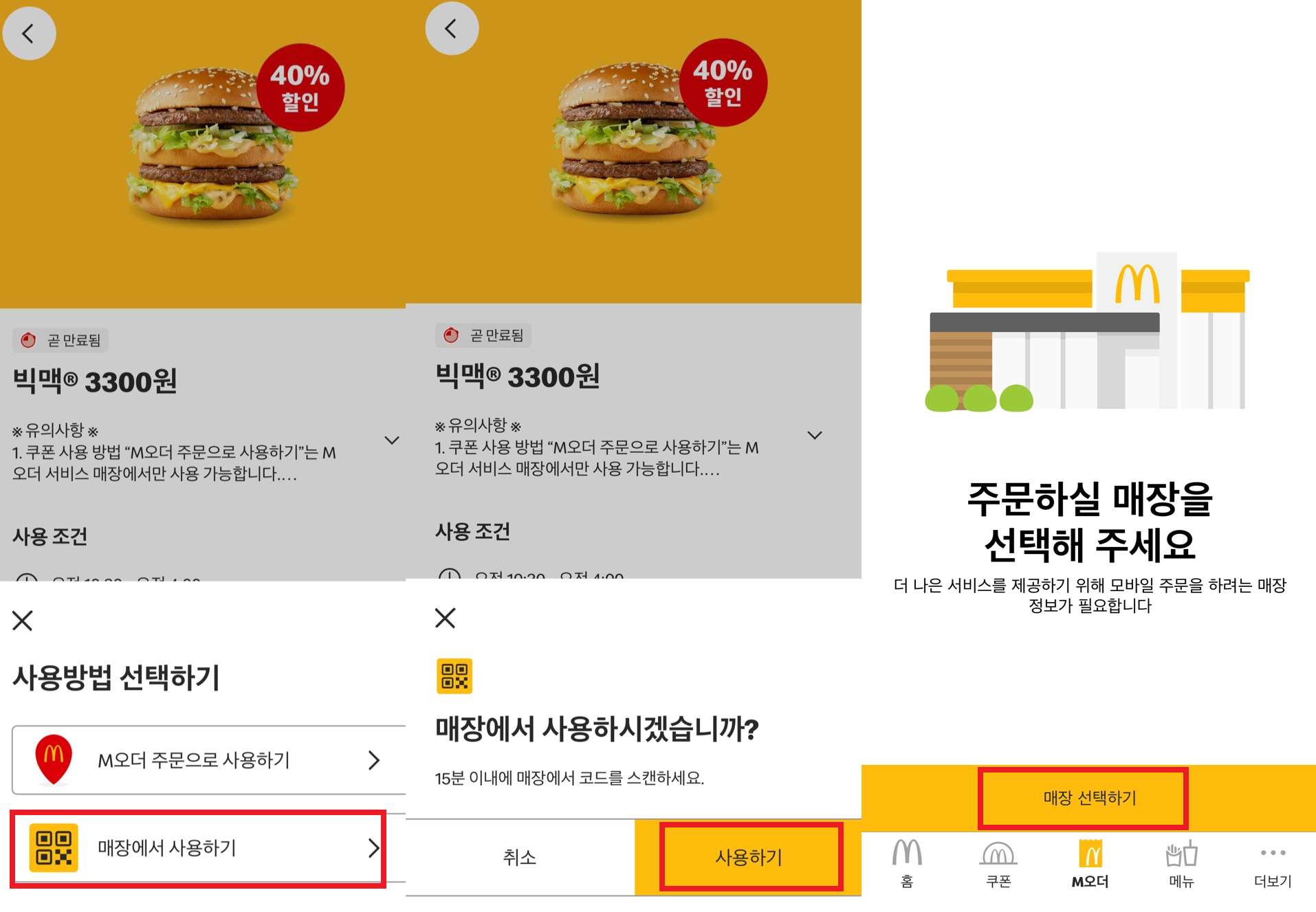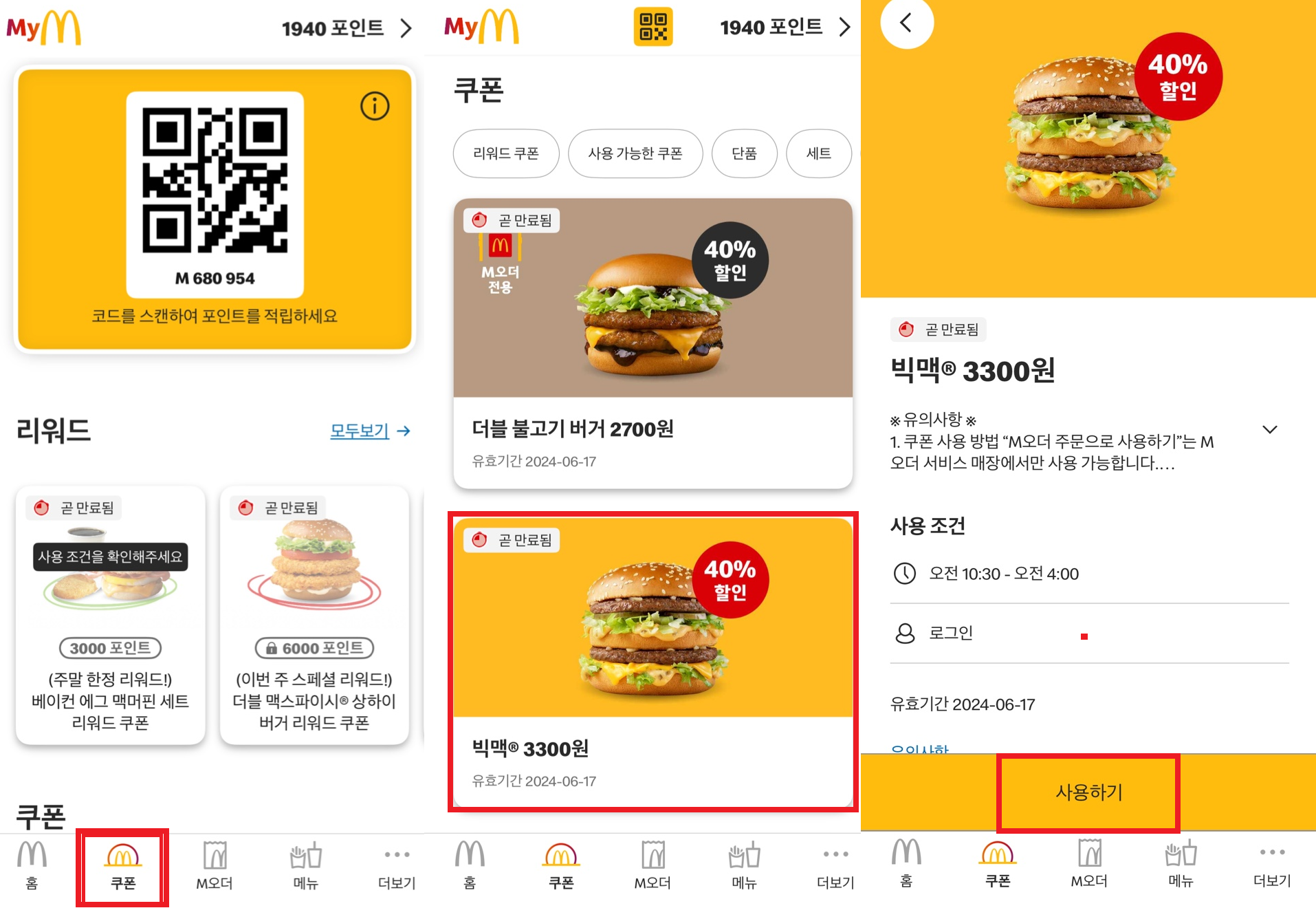 3. 쿠폰에서 빅맥3,300원을 클릭한 후 사용하기를 눌러주세요.