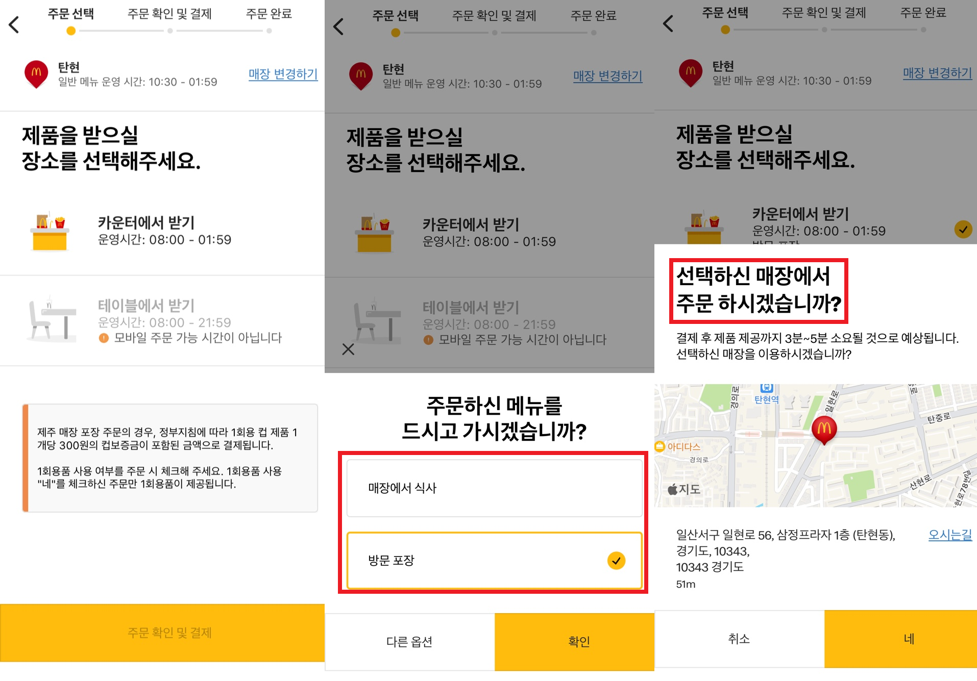5. 내가 방문하려는 맥도날드 지도의 매장 선택하고, 장바구니 담기, 제품 수령장소를 선택합니다.
