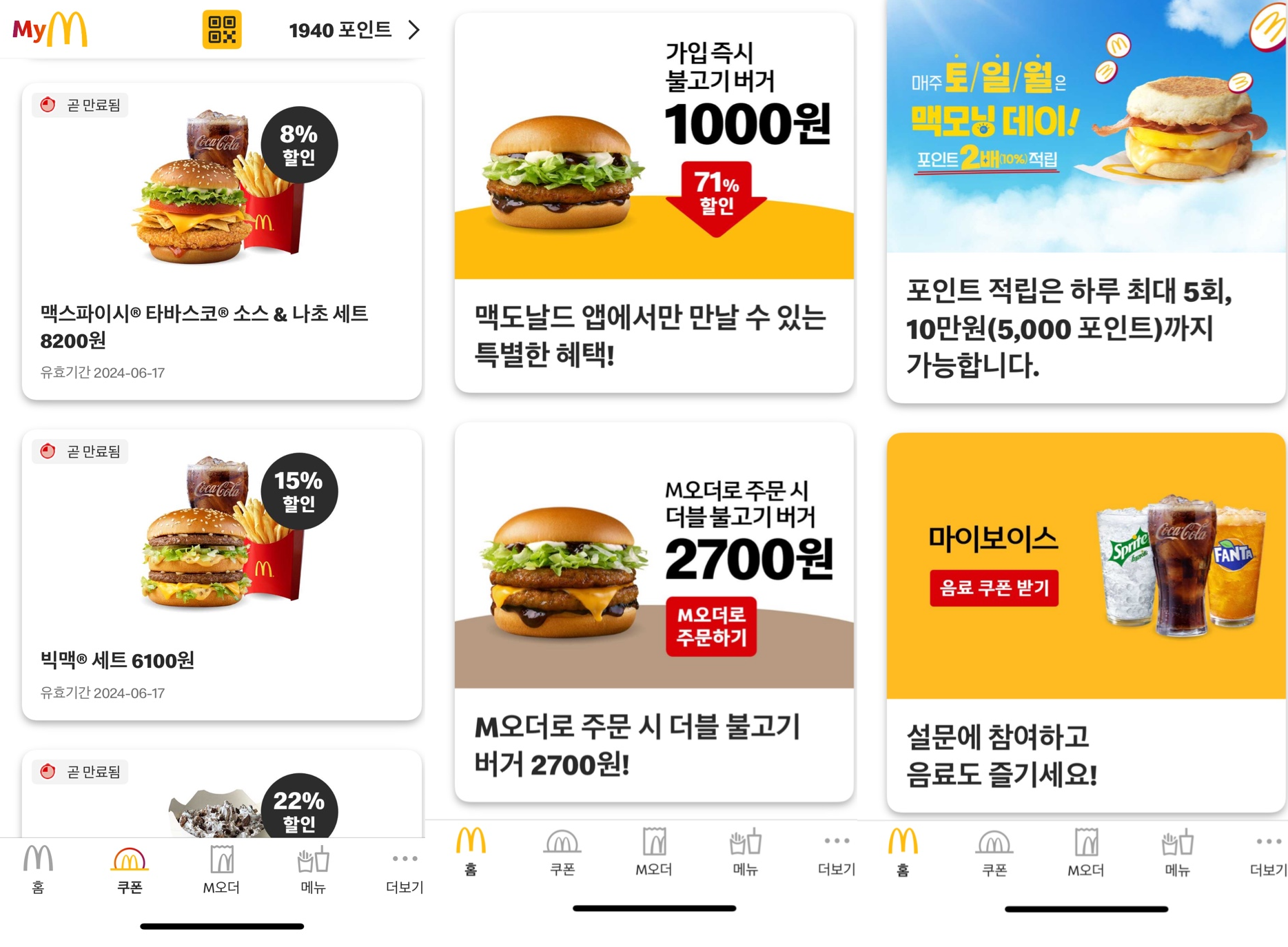 이렇게 맥도날드 앱에서는 매장의 본 가격보다 훨씬 저렴한 가격으로 불고기 버거 1000원, 토 / 일 / 월 맥모닝 데이 포인트 2배 적립, 다양한 메뉴 할인쿠폰 등이 제공되고 있습니다.